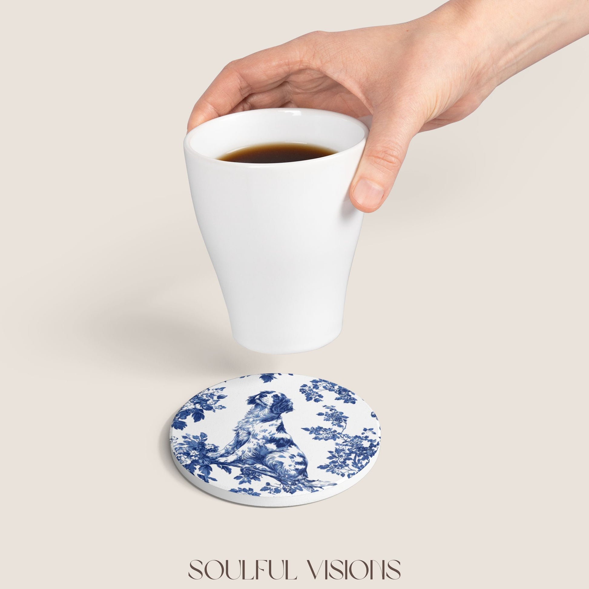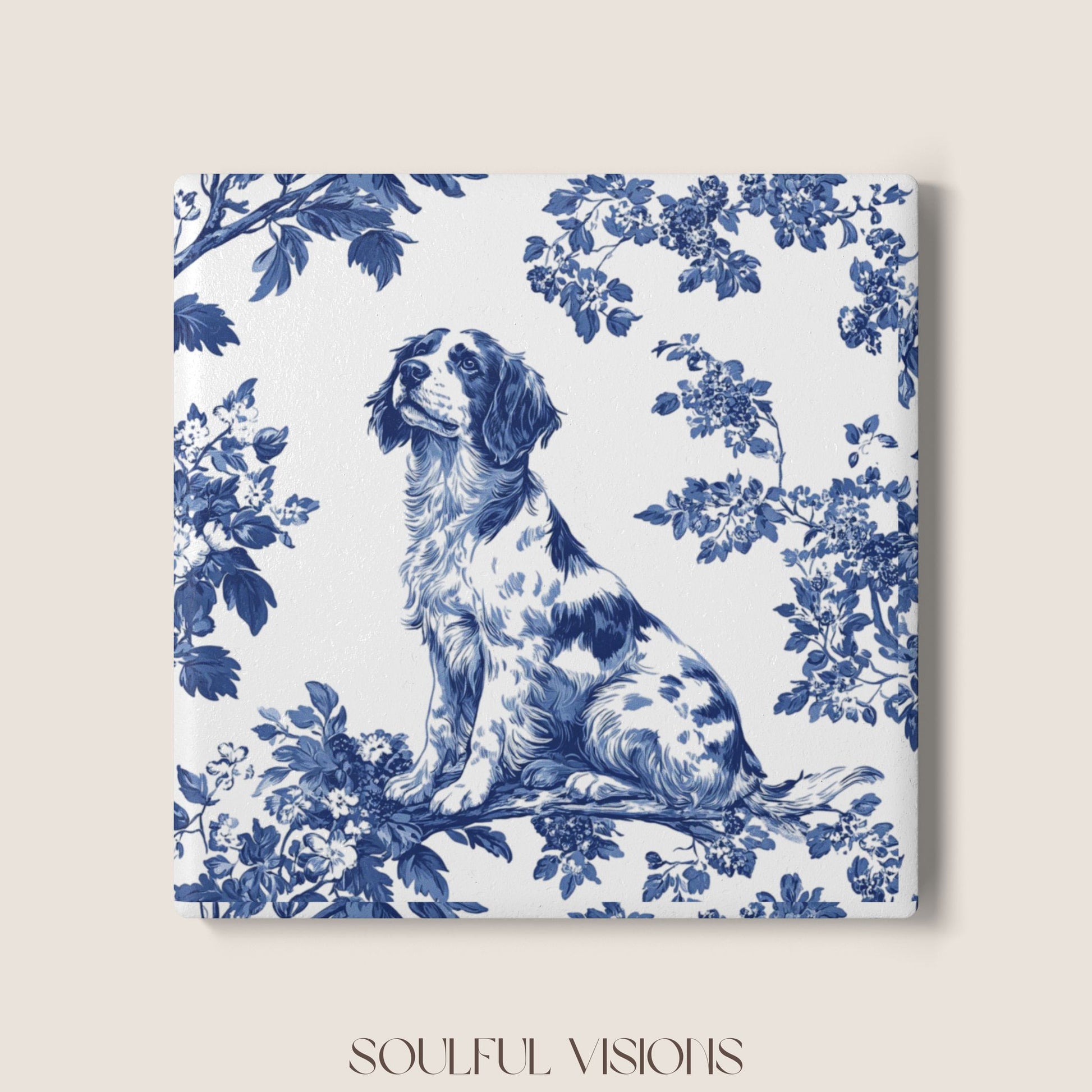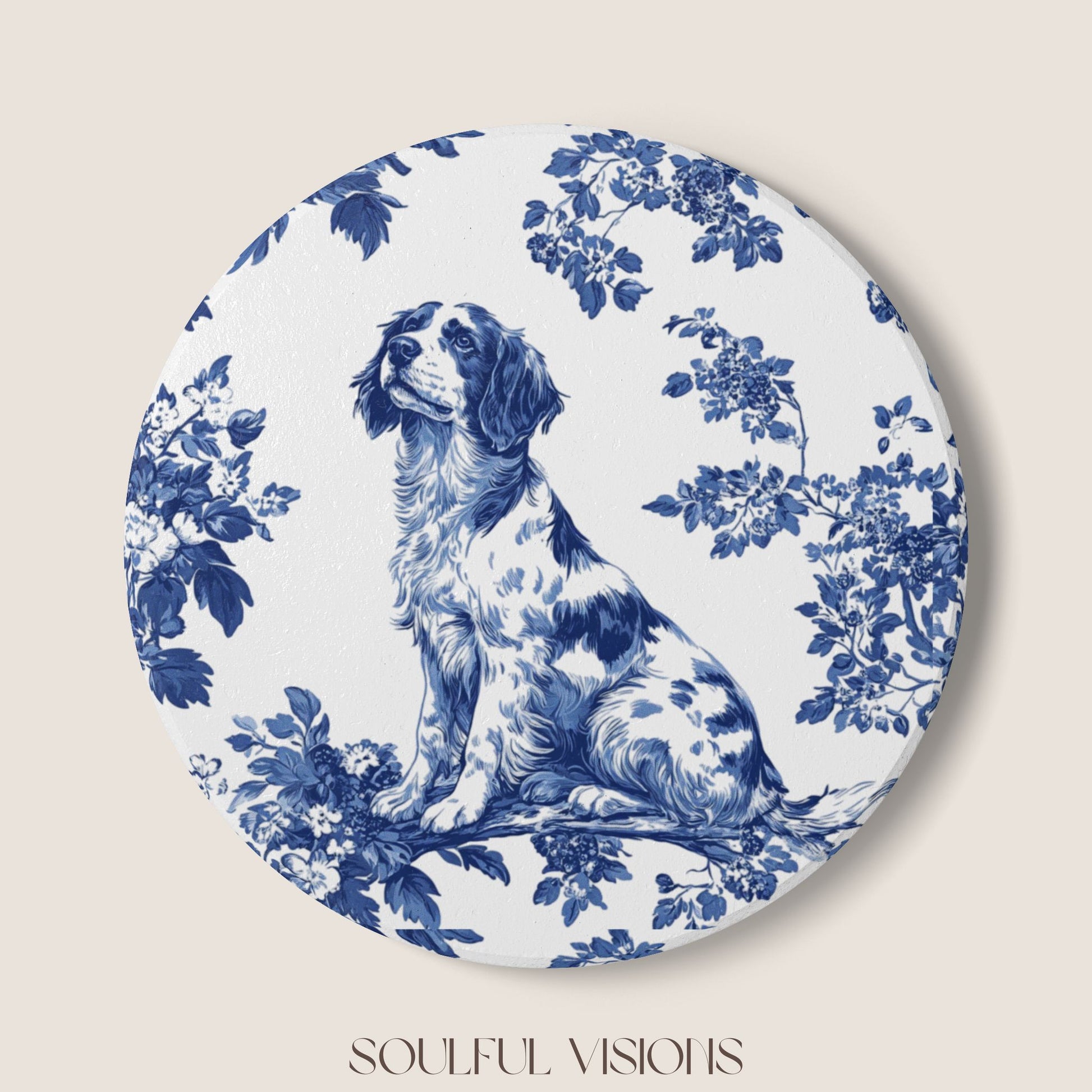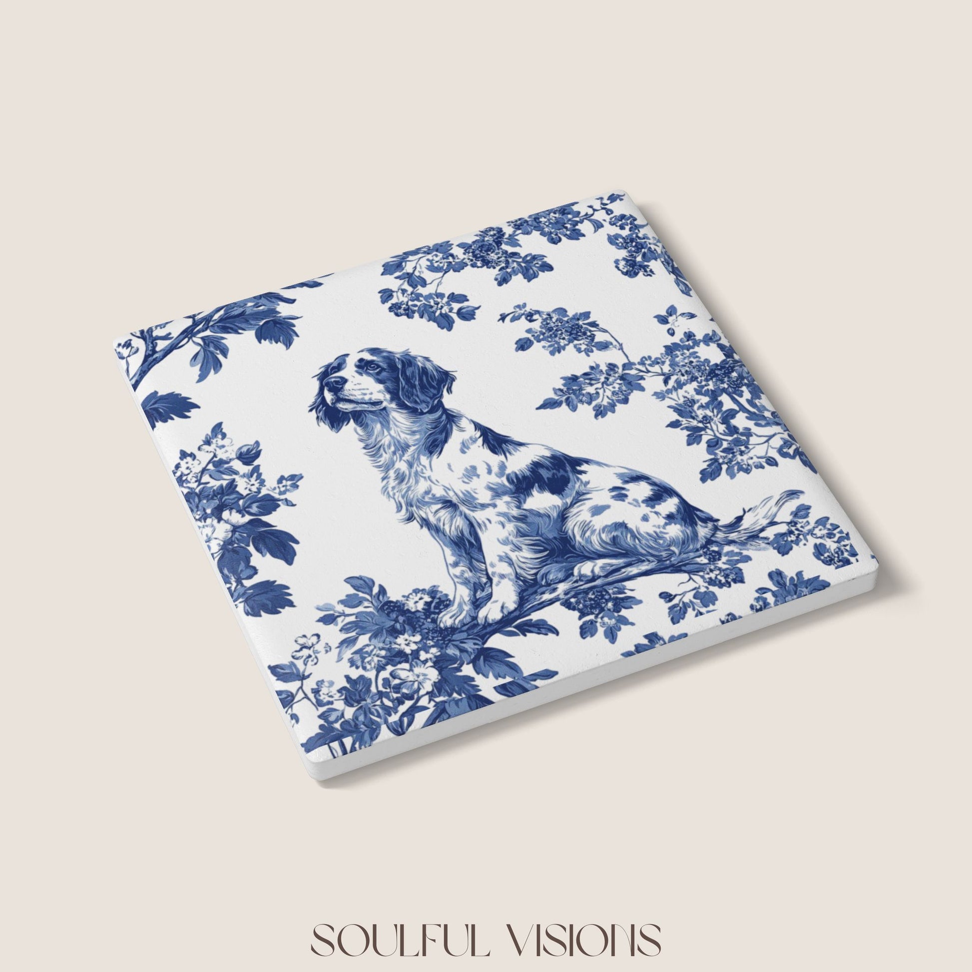 Brittany Spaniel Ceramic Coaster French Blue Toile