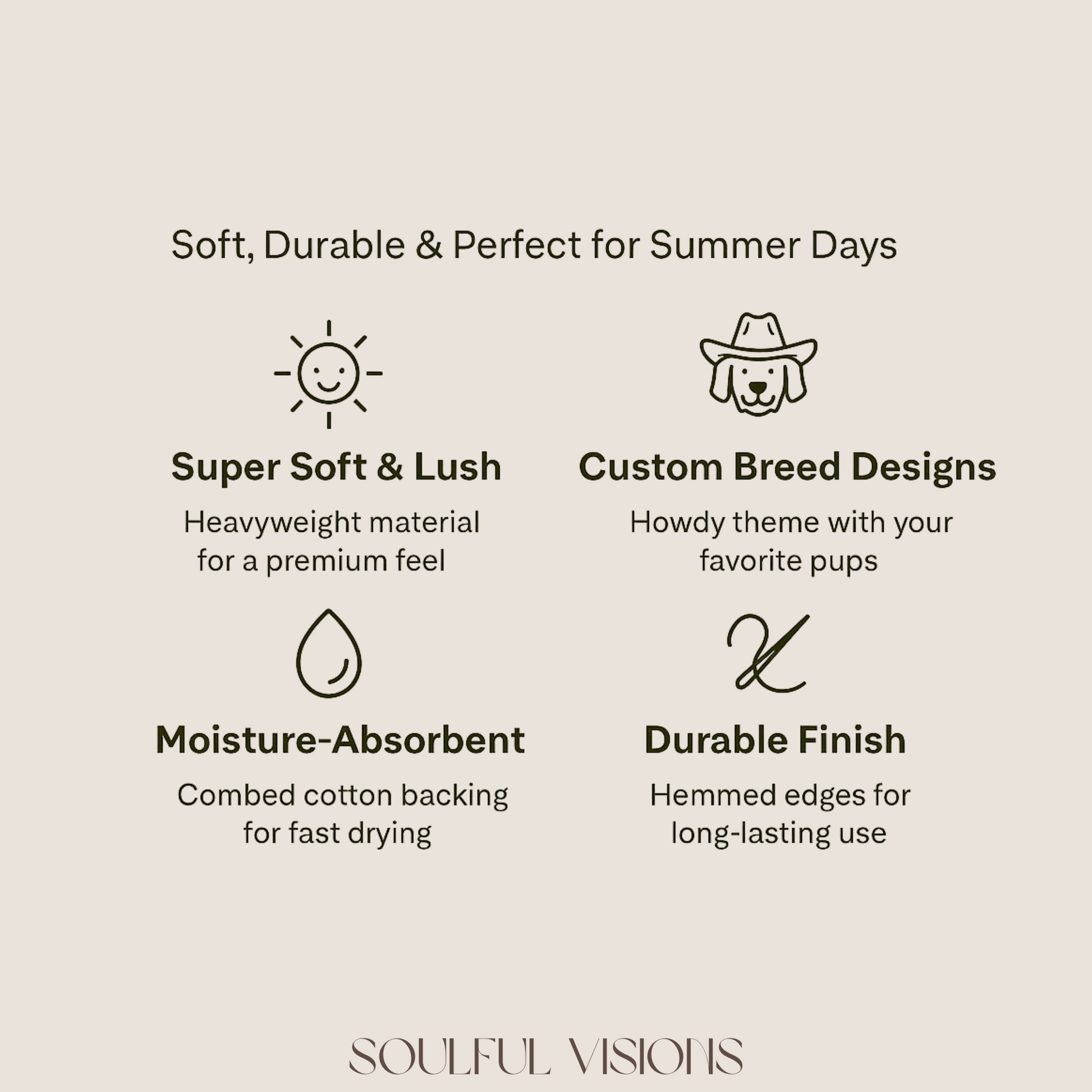 Crafted with a vibrant polyester print side and a cozy cotton loop backing, it combines bold design with lasting comfort. Our vivid Howdy prints feature your favorite breeds in playful Western style – bringing joy to every sunny outing.